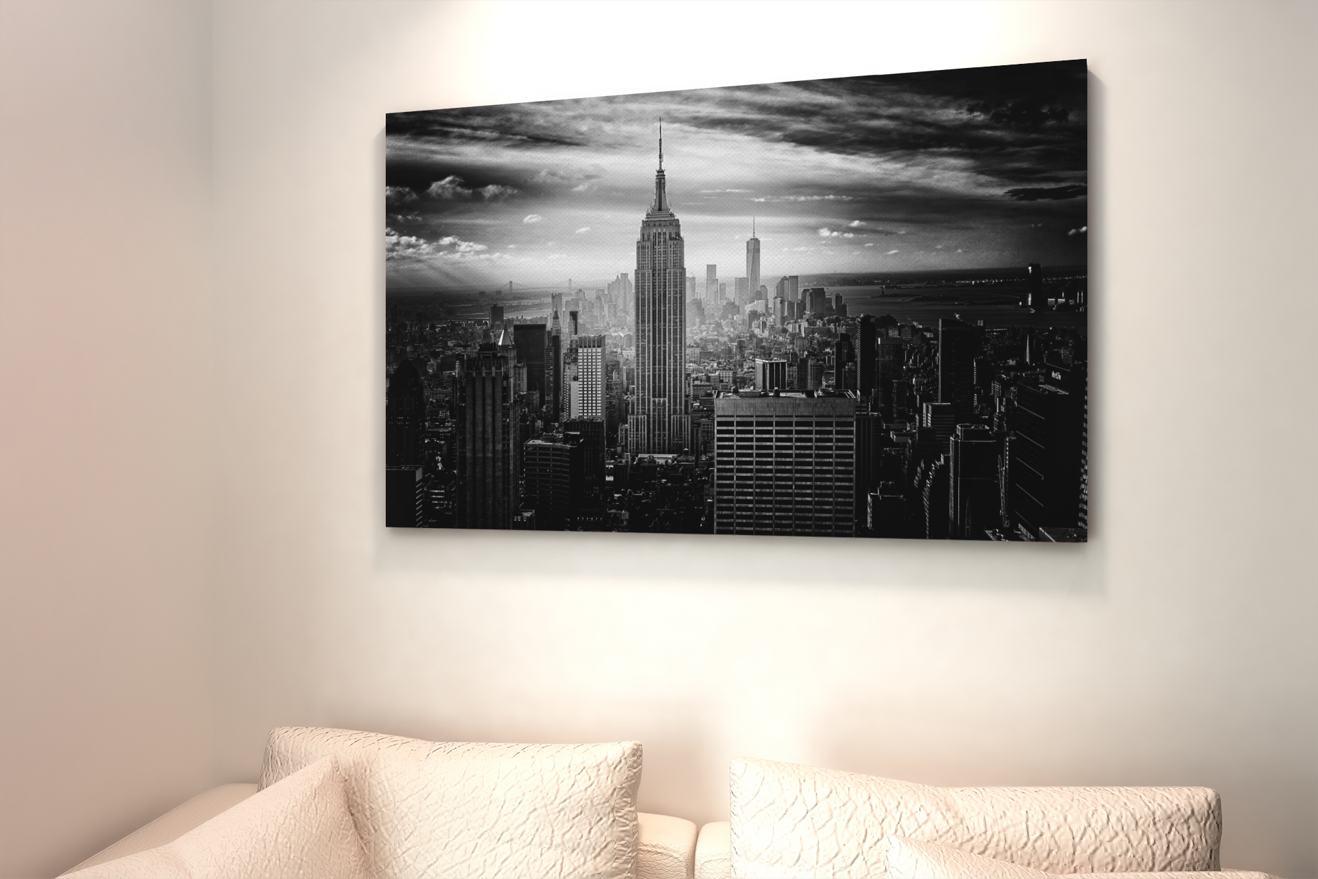 This high quality print masterfully captures the architectural grandeur of the city that never sleeps. The dramatic play of light and shadow in black and white emphasizes the towering skyscrapers, creating a scene of timeless elegance and undeniable allure.