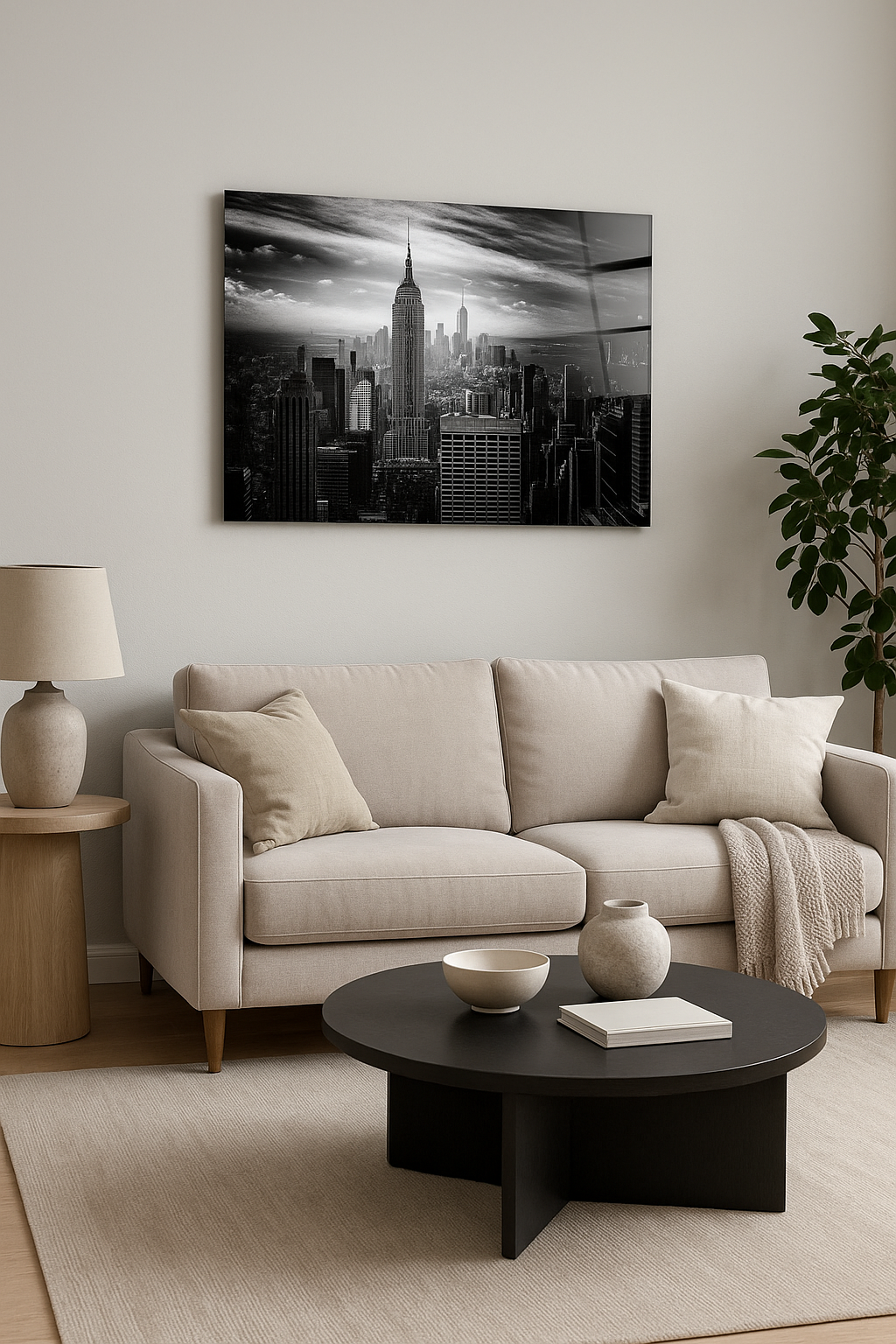 Transform your space into a sophisticated urban oasis with this stunning black and white acrylic glass wall art featuring the iconic Empire State Building and the captivating downtown New York City skyline!