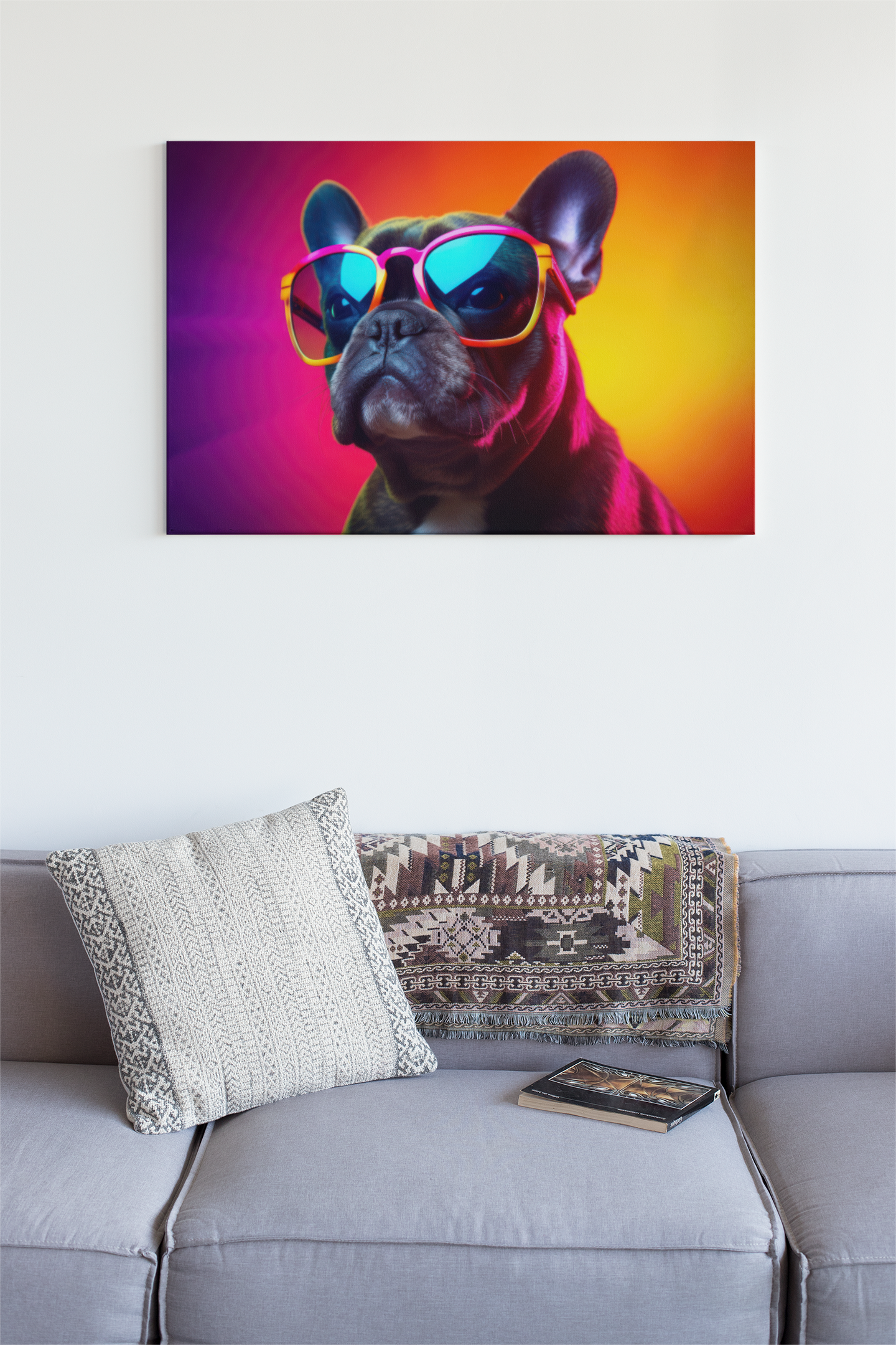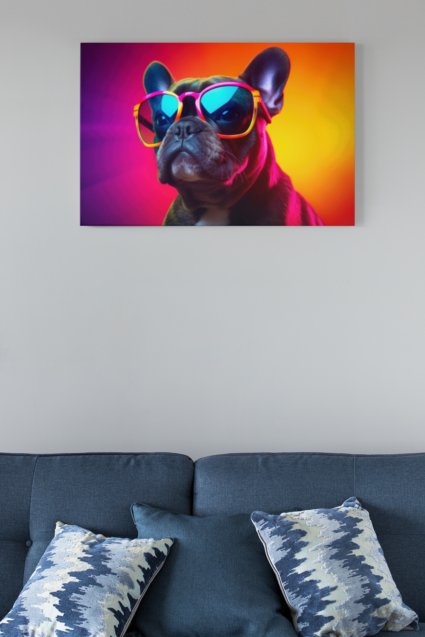 With its endearing expression and fashionable accessory, the bulldog exudes confidence and character, making it a whimsical addition to any room. Whether displayed in a living room, bedroom, or office, this artwork is sure to bring smiles and brighten your day.