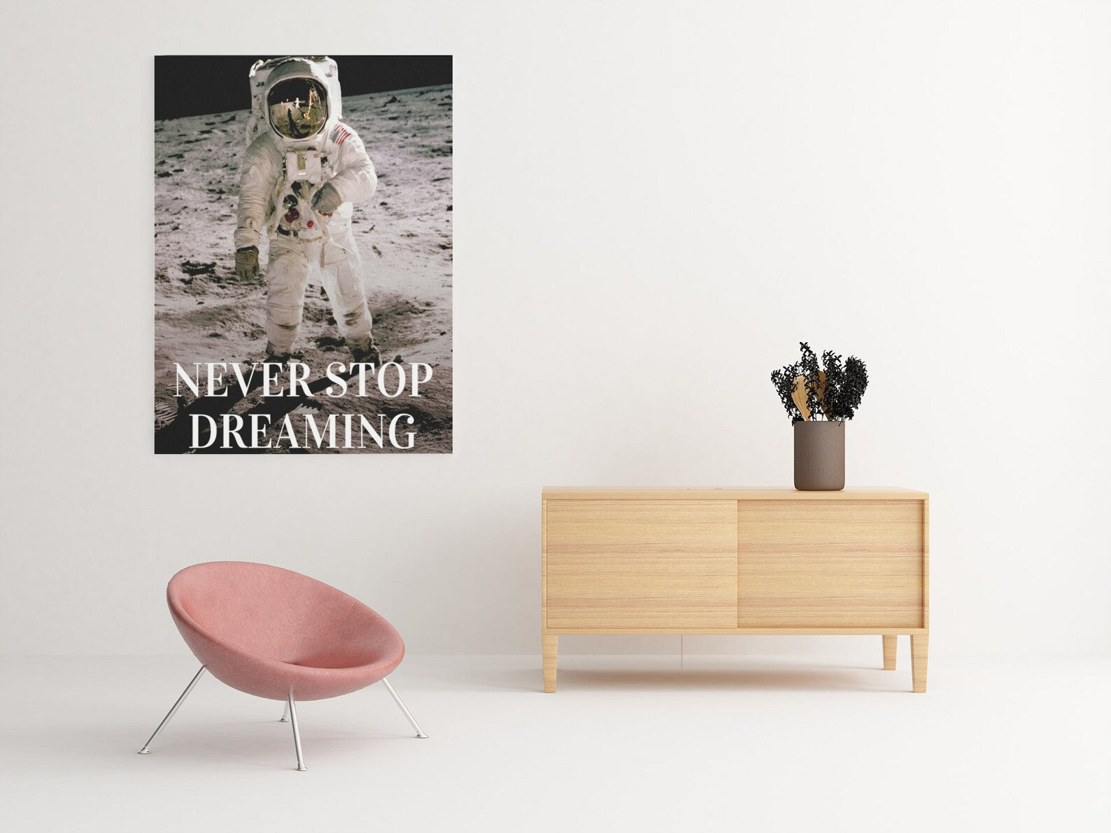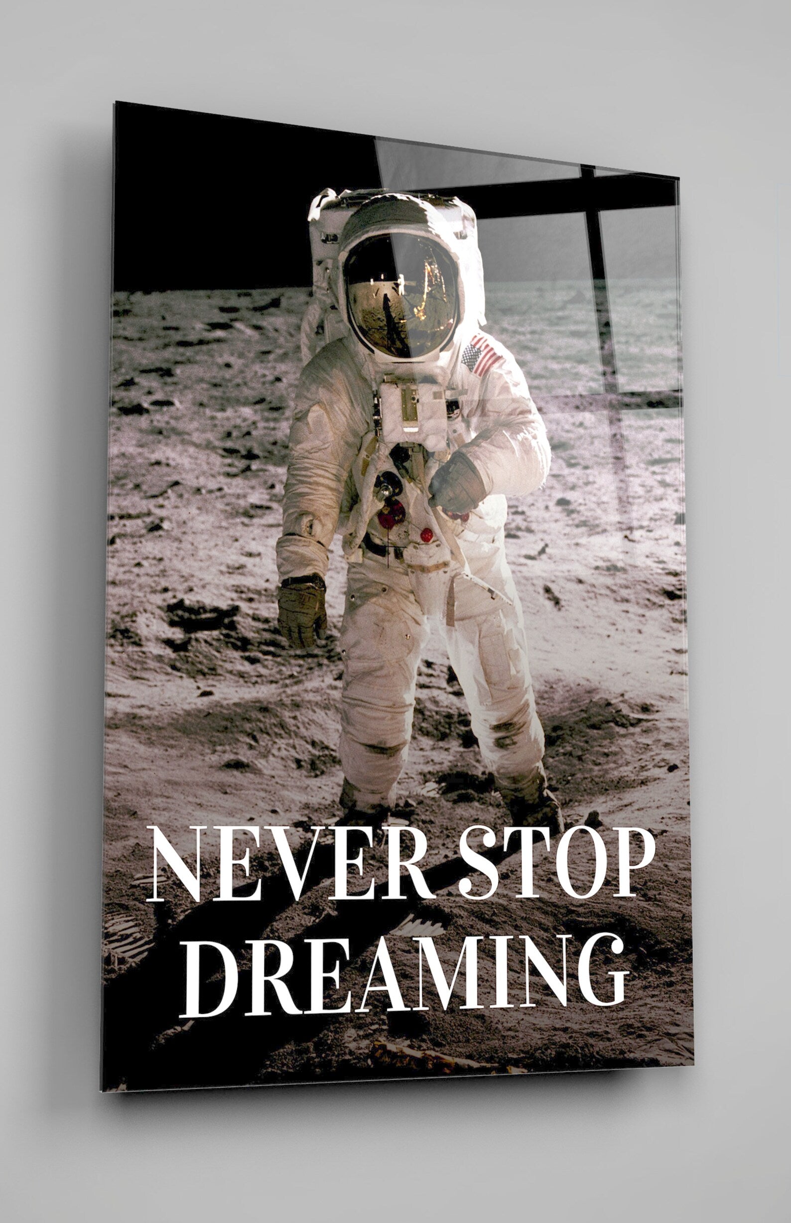 Transform your space into a source of inspiration with our Buzz Aldrin "NEVER GIVE UP" Quote Space Glass Wall Art Print. Featuring Buzz Aldrin on the moon, this art print captures the essence of the Apollo lunar mission and serves as a tribute to humanity's indomitable spirit of exploration. Whether displayed as space wall art or incorporated into your home decor, let it ignite your imagination and propel you towards new frontiers.