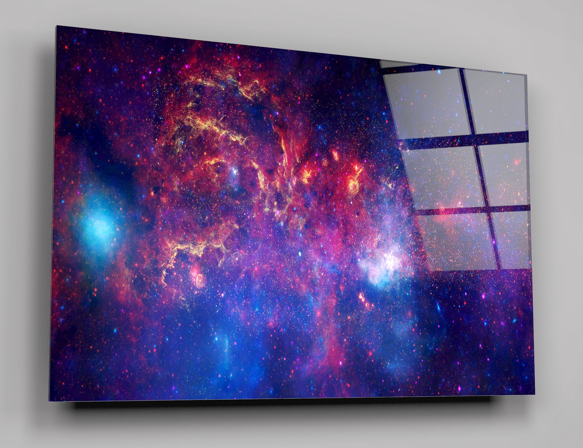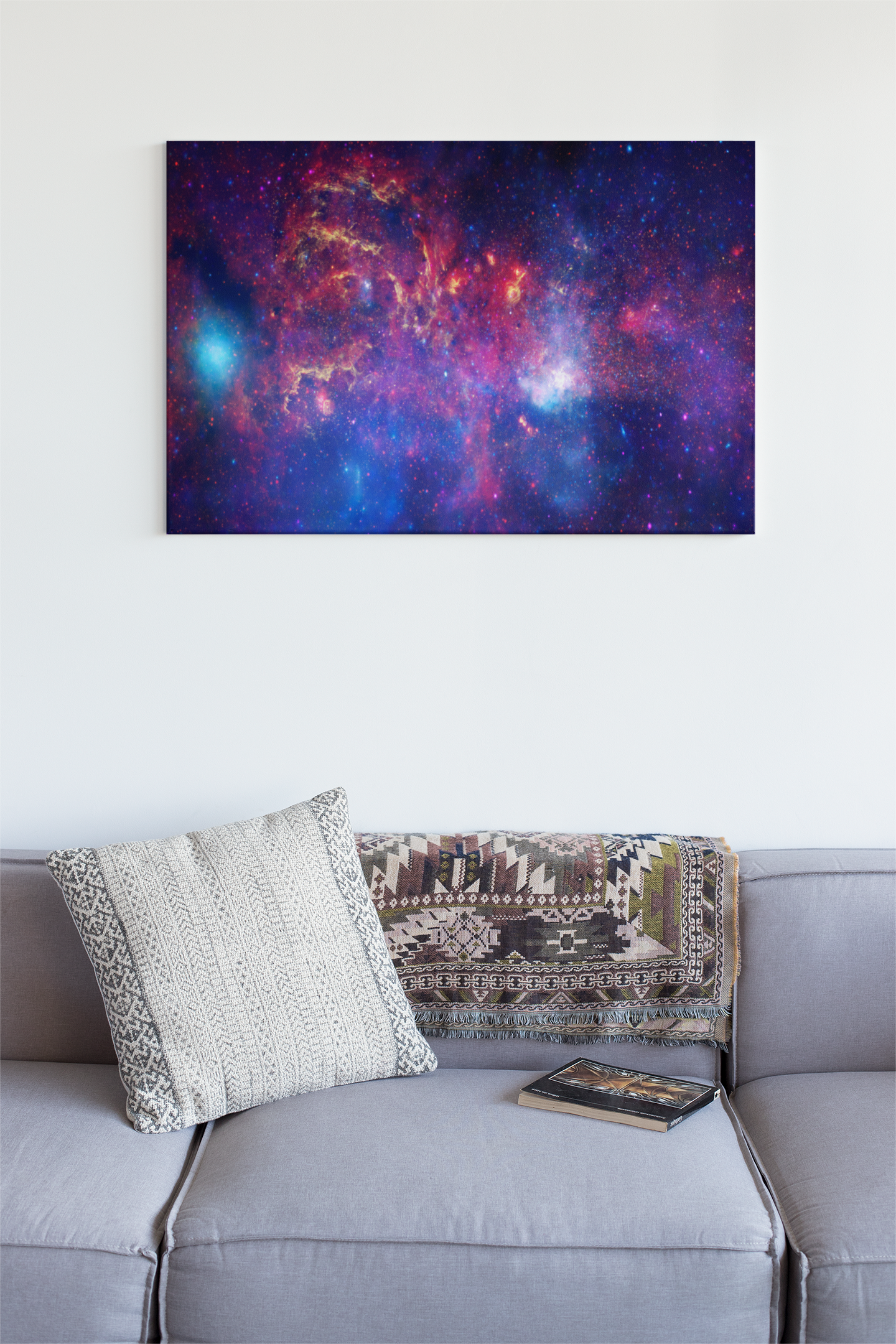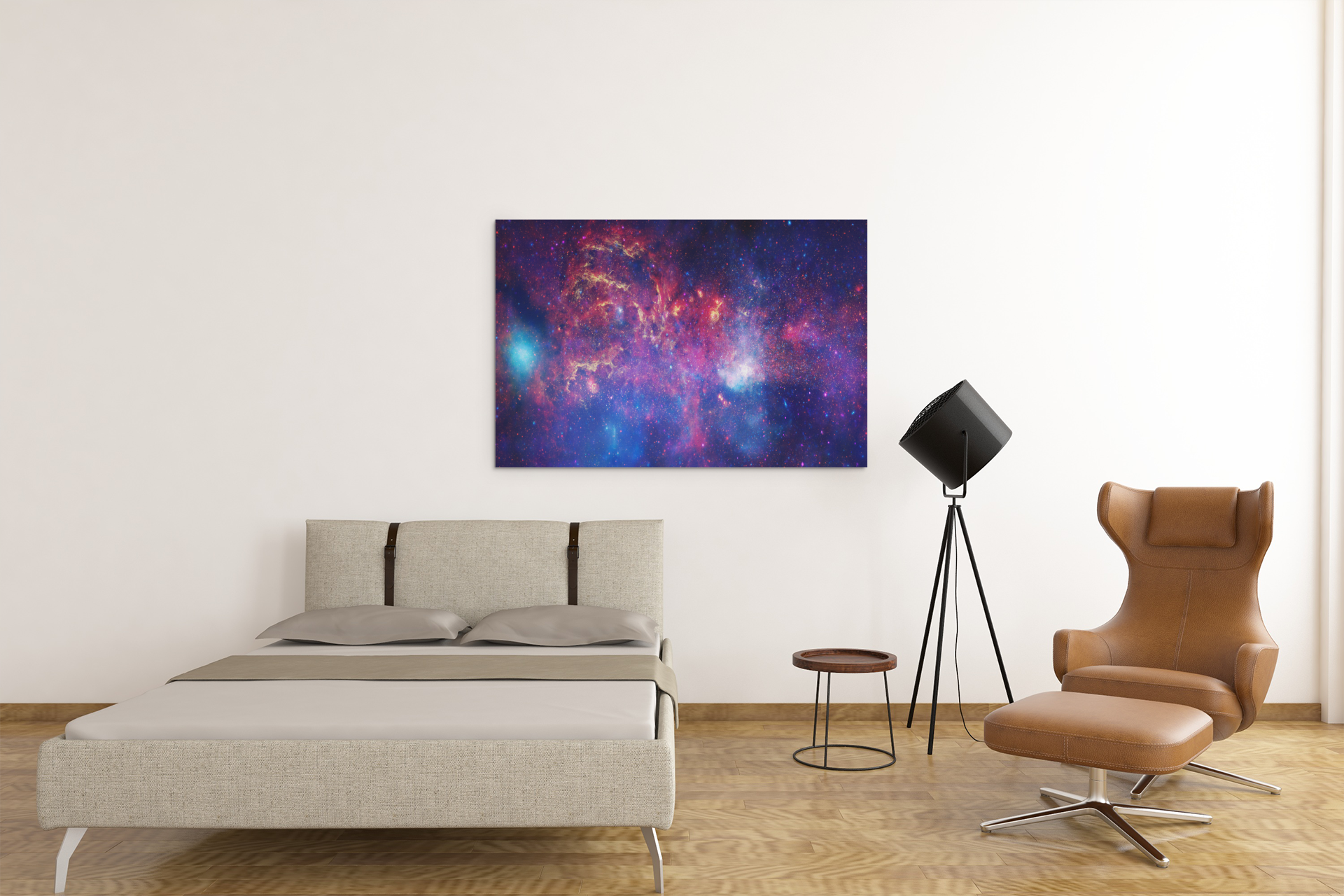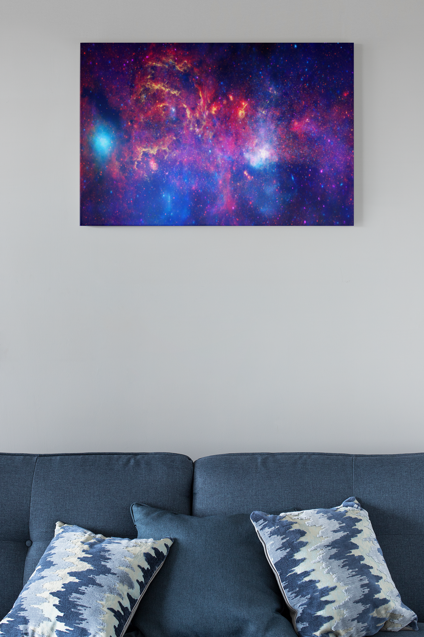 Crafted with exceptional detail and precision, our glass wall art print presents a breathtaking fusion of infrared and X-ray observations, penetrating through the veil of obscuring dust to unveil the intense activity teeming near the galactic core. The central region, pulsating with cosmic energy, is illuminated in vivid hues, each colour representing the distinct contributions of Hubble, Spitzer, and Chandra.
