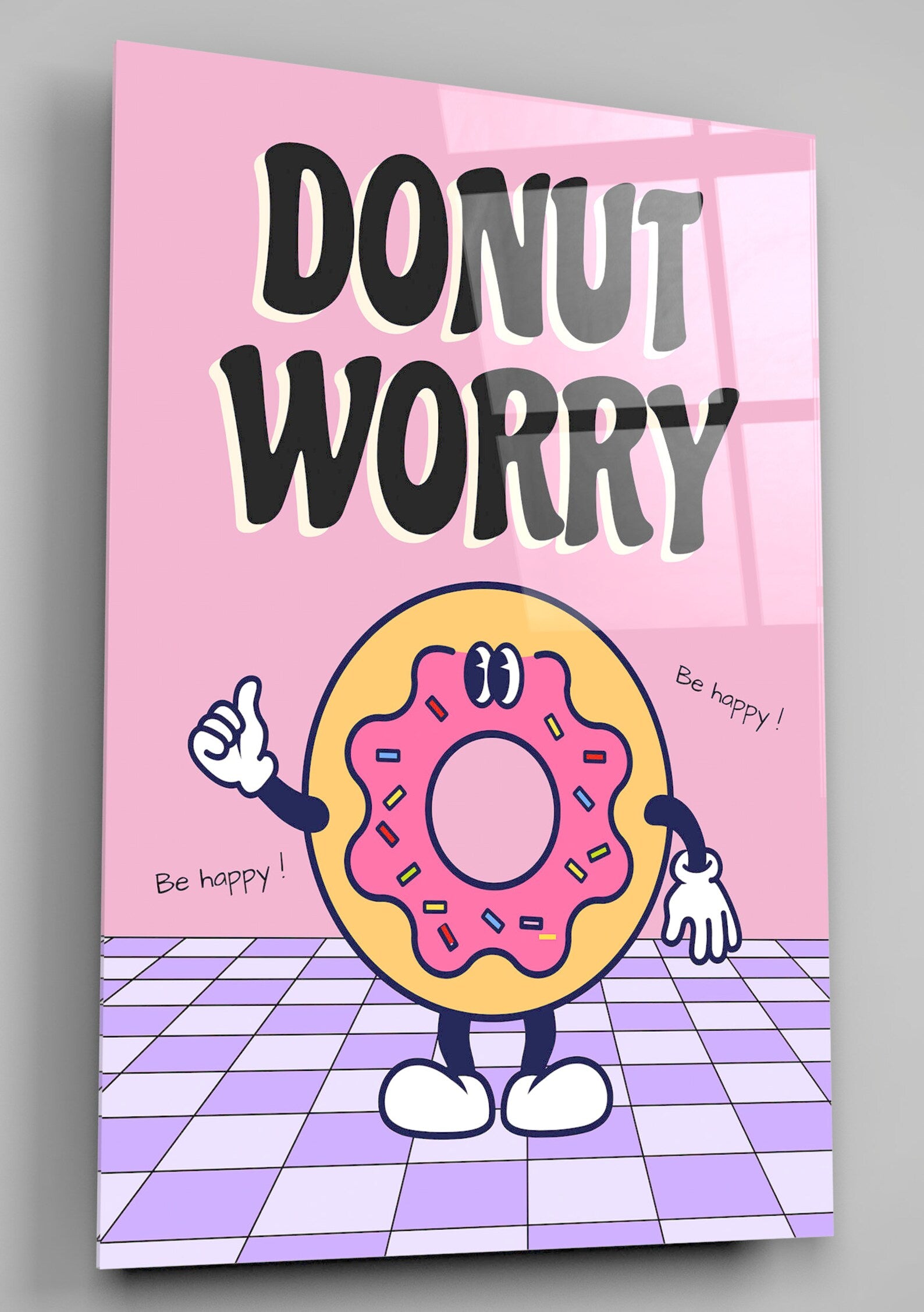 Introducing our delightful and uplifting Acrylic Glass Wall Art featuring a charming depiction of a scrumptious doughnut paired with the heartening mantra, "Donut Worry, Be Happy."