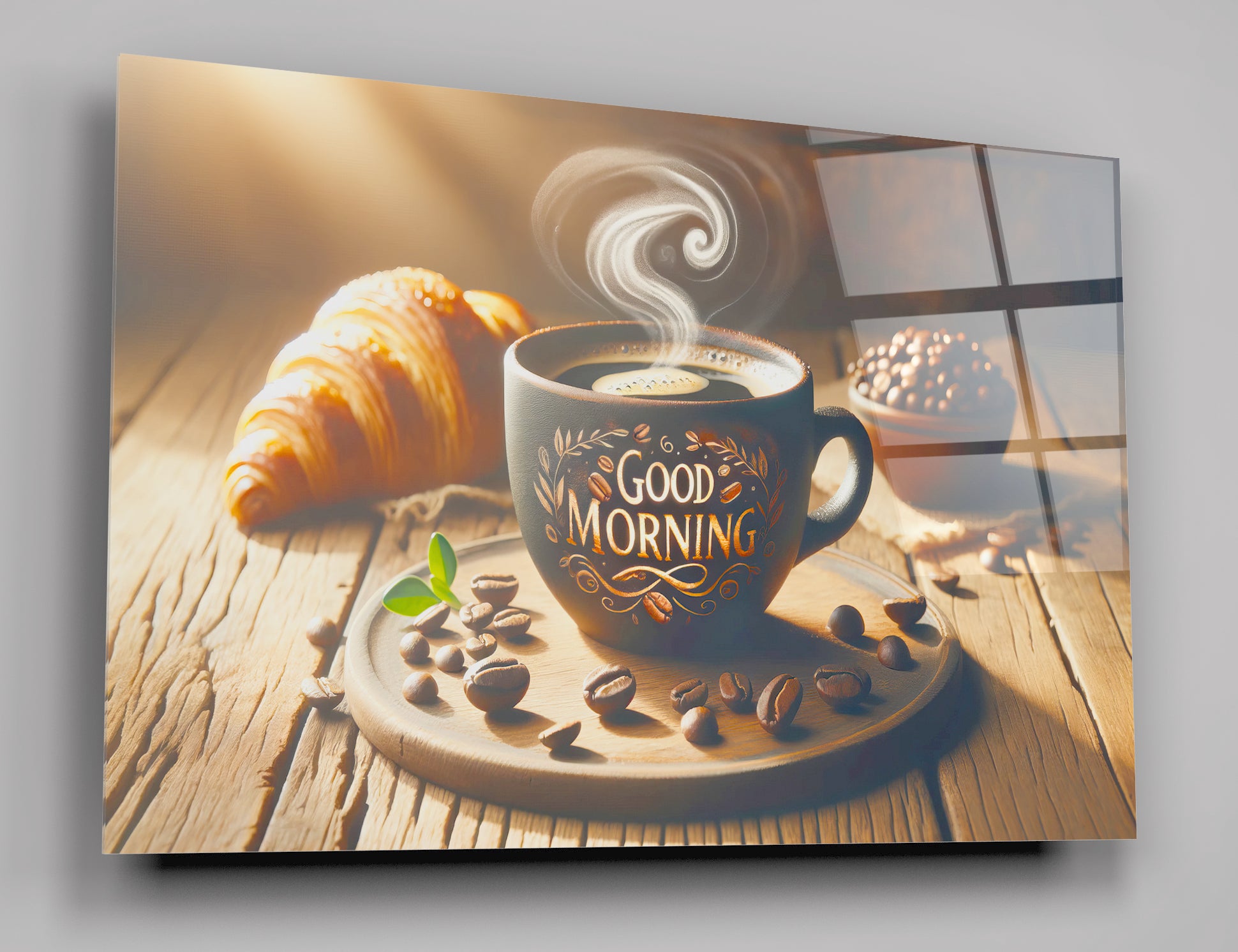 Bring a smile to your face (and a pep to your step) every morning with this delightful "Good Morning Coffee" acrylic glass wall art!