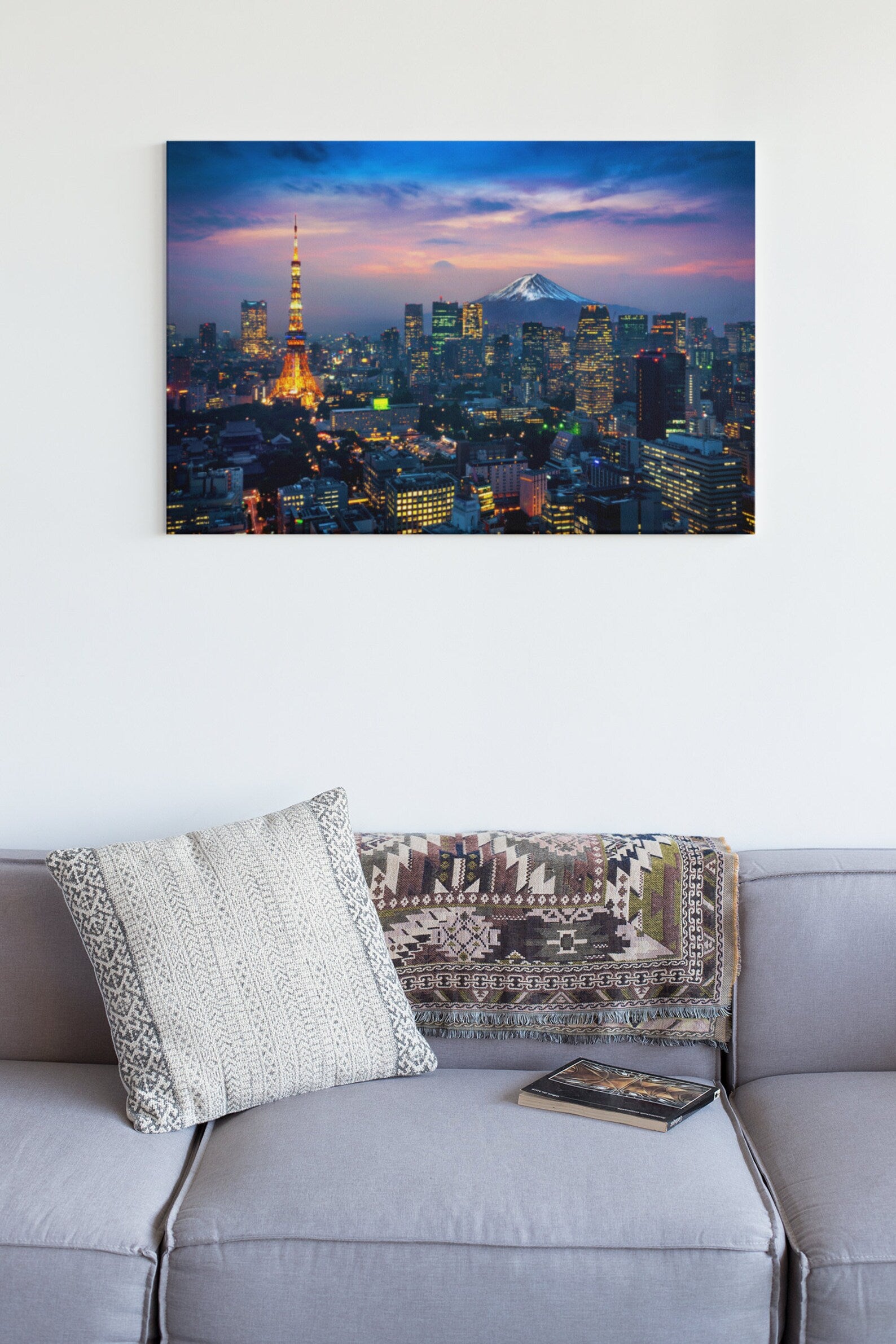 This stunning artwork captures the iconic skyline of Tokyo against the majestic backdrop of Mount Fuji, Japan's tallest peak. The city lights shimmer against the night sky, while the silhouette of Mount Fuji rises gracefully in the distance, creating a mesmerizing contrast of urban and natural landscapes.